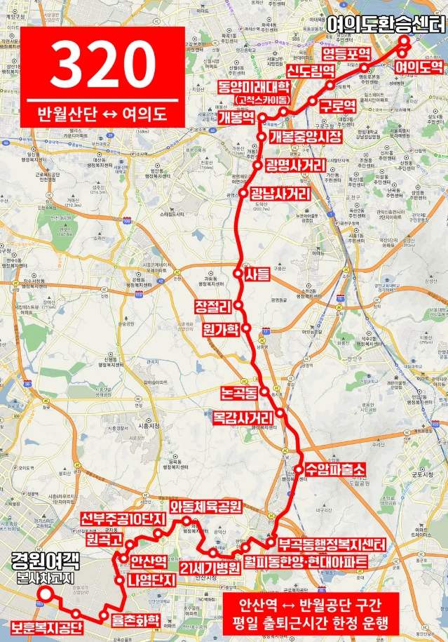 안산시 경원여객을 출발하여 안산역, 원곡동, 와동, 부곡동, 광남사거리. 광명교육청, 구로역, 신도림역, 영등포역✅을 거쳐 여의도환승센터로 직행하는 안산 320번 버스의 최신 시간표와 노선, 요금, 타는 곳을 빠르게 확인할 수 있도록 안내해 드리겠습니다.