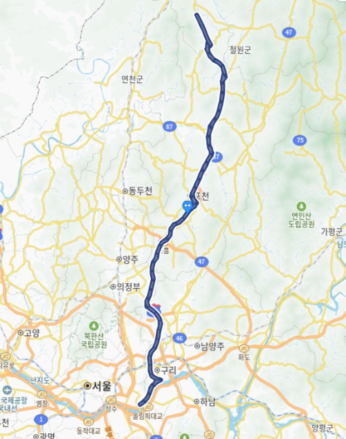 ▶동송터미널 - 상노1리 - 관인버스터미널 - 사정리.사단앞 - 영북면사무소 -양문1리터미널 - 포천공영버스(시외버스) - 동서울터미널